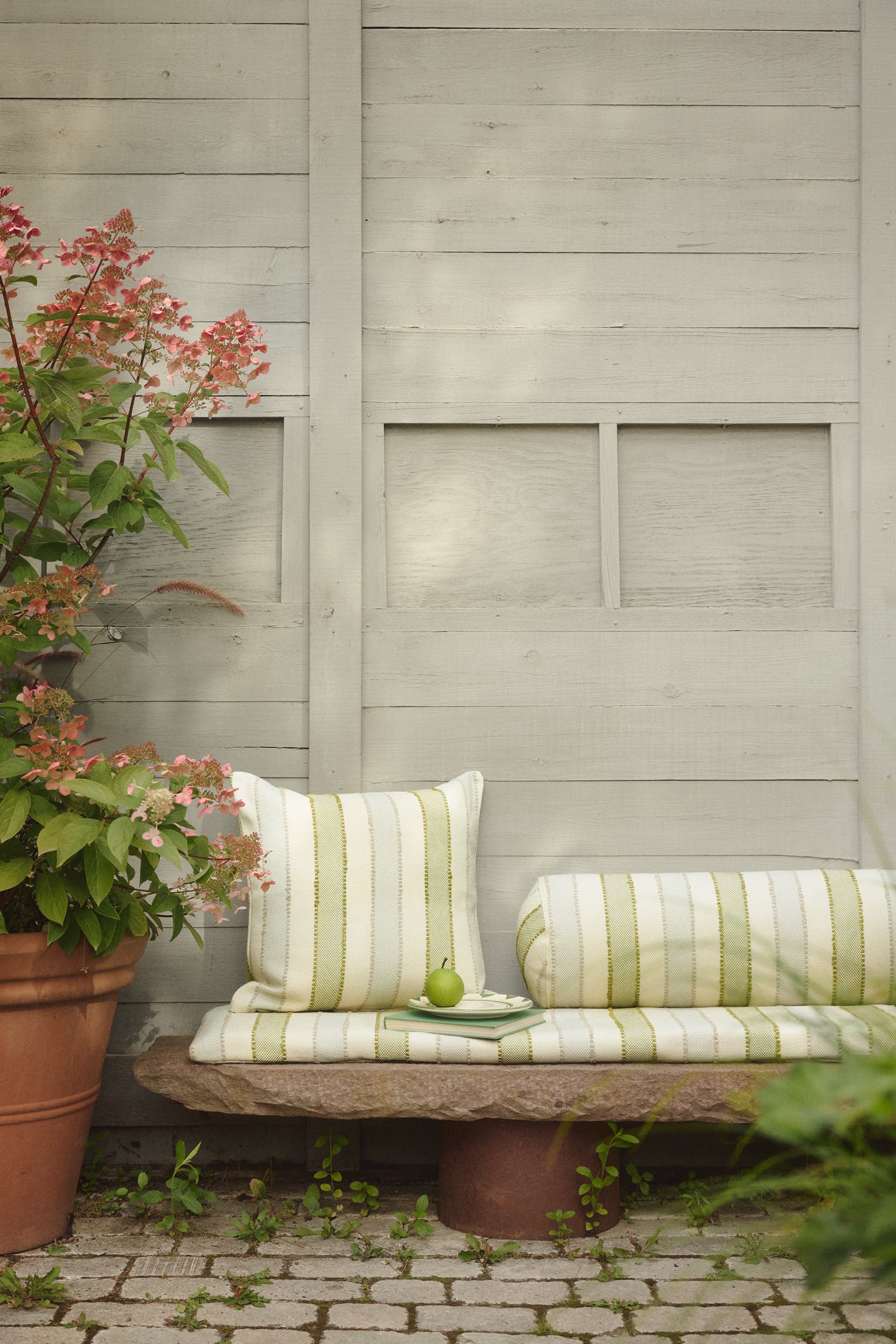 Kleine, durchdachte Entscheidungen können eine große Wirkung auf Ihr Zuhause und unseren Planeten haben. Ein frischer Satz Kissenbezüge kann Ihre Außenmöbel auf Ihre persönliche Art und Weise wiederbeleben. Und indem Sie die Lebensdauer Ihrer Möbel verlängern, reduzieren Sie auch Abfall. Die Outdoor-Stoffe der A Greener Collection werden bewusst aus nachhaltigen Materialien hergestellt und sind so konzipiert, dass sie auch in der Sonne ausdrucksstark bleiben und nach einem sommerlichen Regenschauer schnell wieder trocknen. Ob mit der Eleganz von Samt oder mit strukturierten Streifen – diese langlebigen Textilien sind bereit für lebenslanges Entspannen.