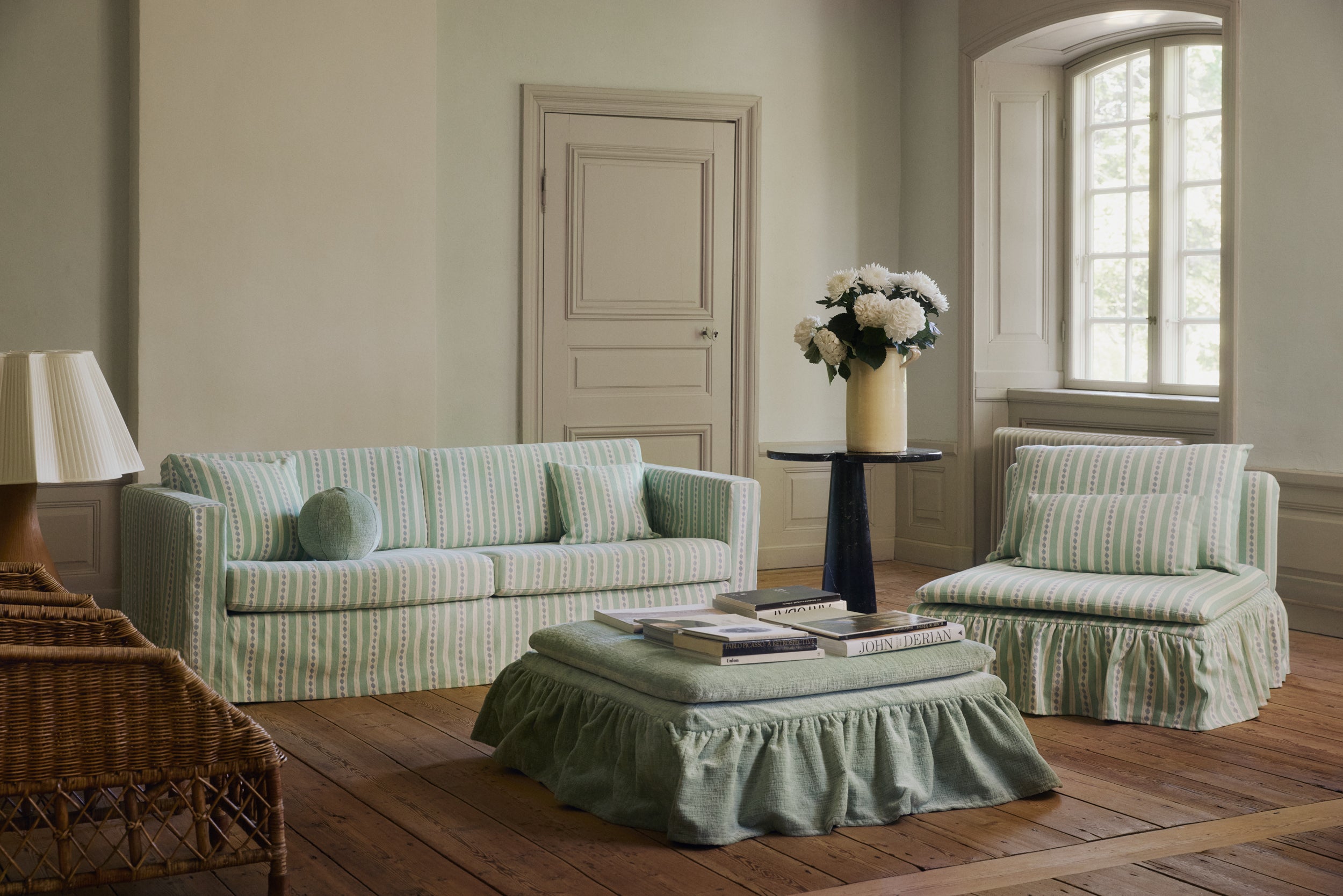 Évelyn tiene rayas color verde y azul bígaro inspiradas en la casa de la tía de Natalie, mi mejor amiga. Es un estilo sereno y casual que dejó un recuerdo duradero en mi memoria. También hace referencia al encanto de las cocinas y los salones pintados, que son espacios donde la vida se desarrolla lentamente.