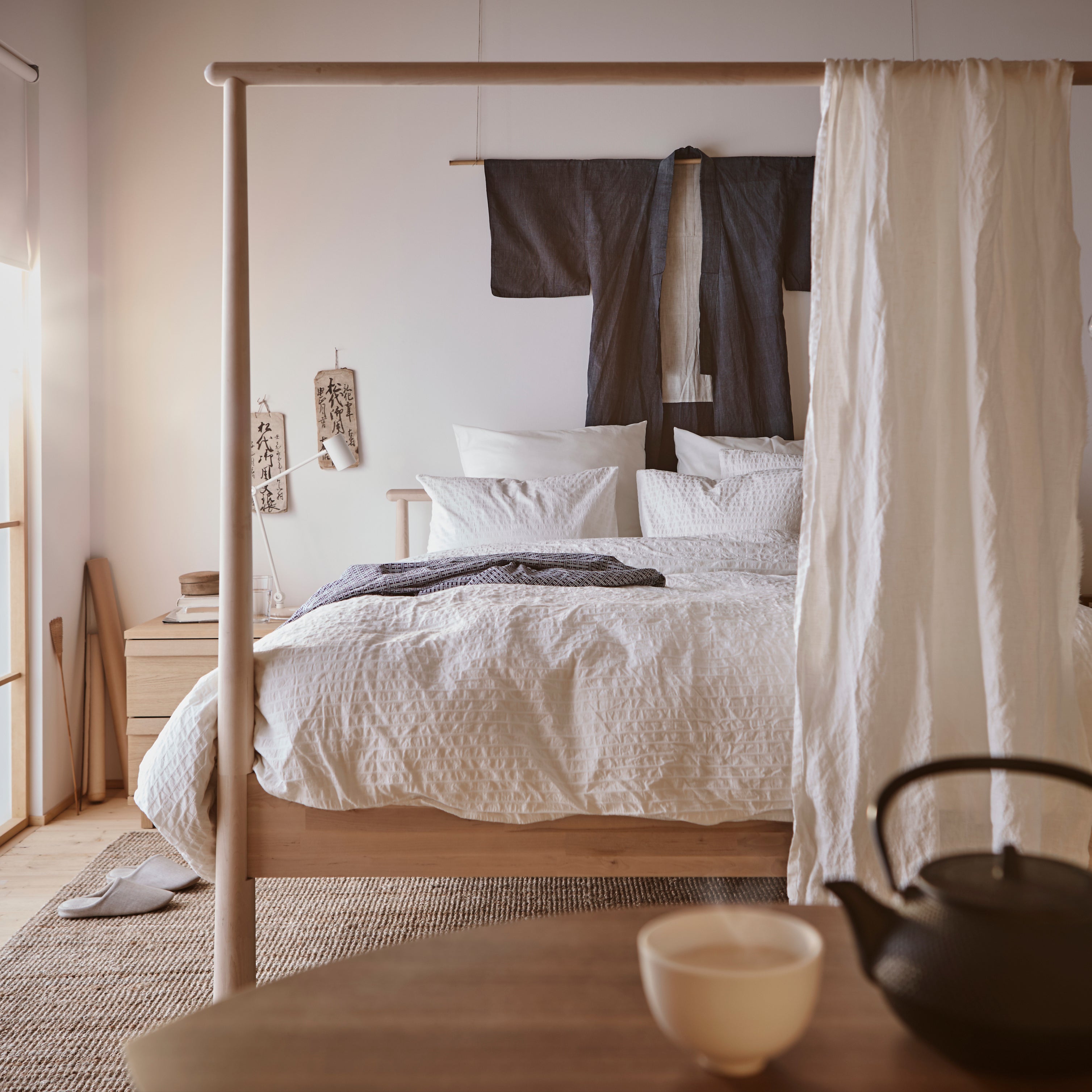 The new IKEA Gjöra bed frame is making all of our childhood four-post bed dreams come to life in a chic, modern setting. With its neutral colour palette and artfully layered linens this Japanese-inspired bedroom is giving us all of the *feels*. Drape fabrics or hang curtains off the taller end of the bed to create that cozy cocoon-like feel. For added comfort add a Bemz bedspread and some throw pillows.