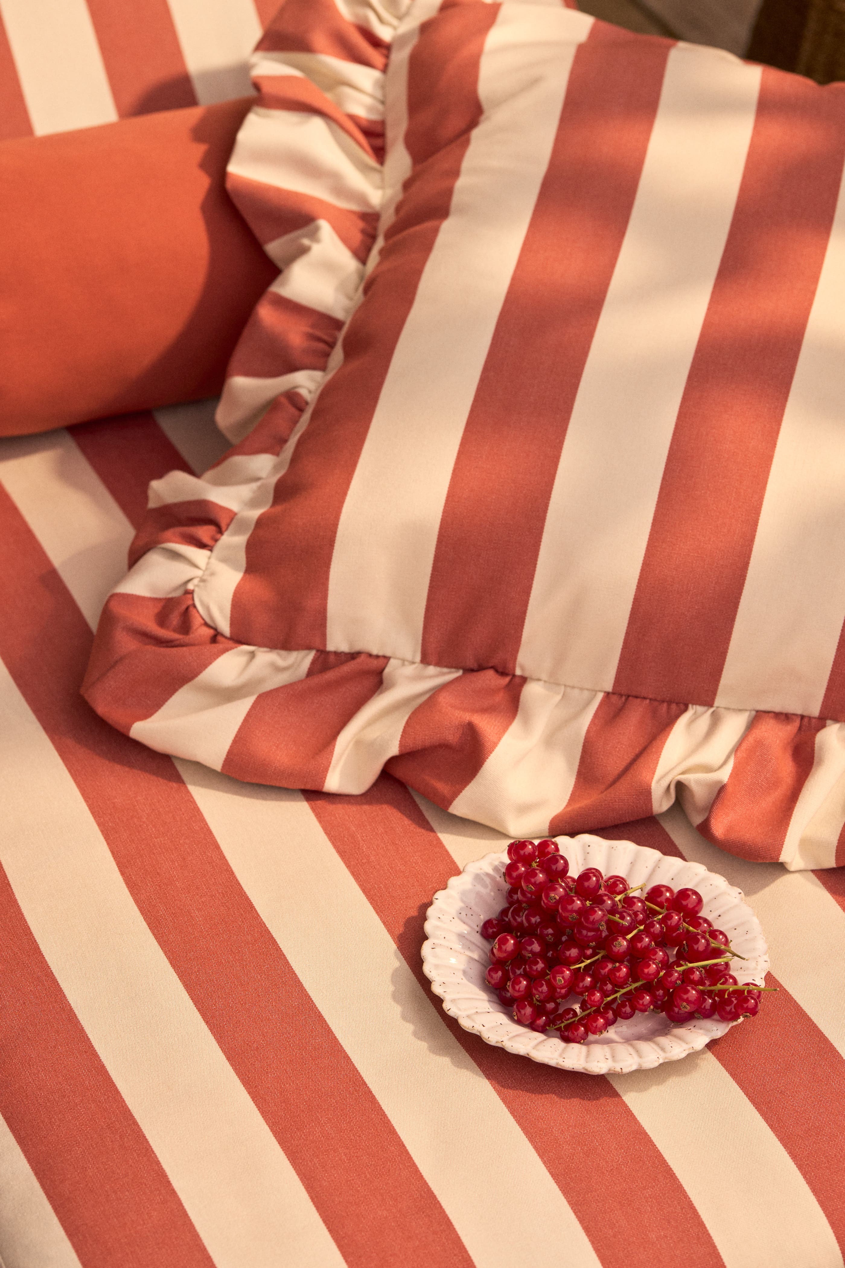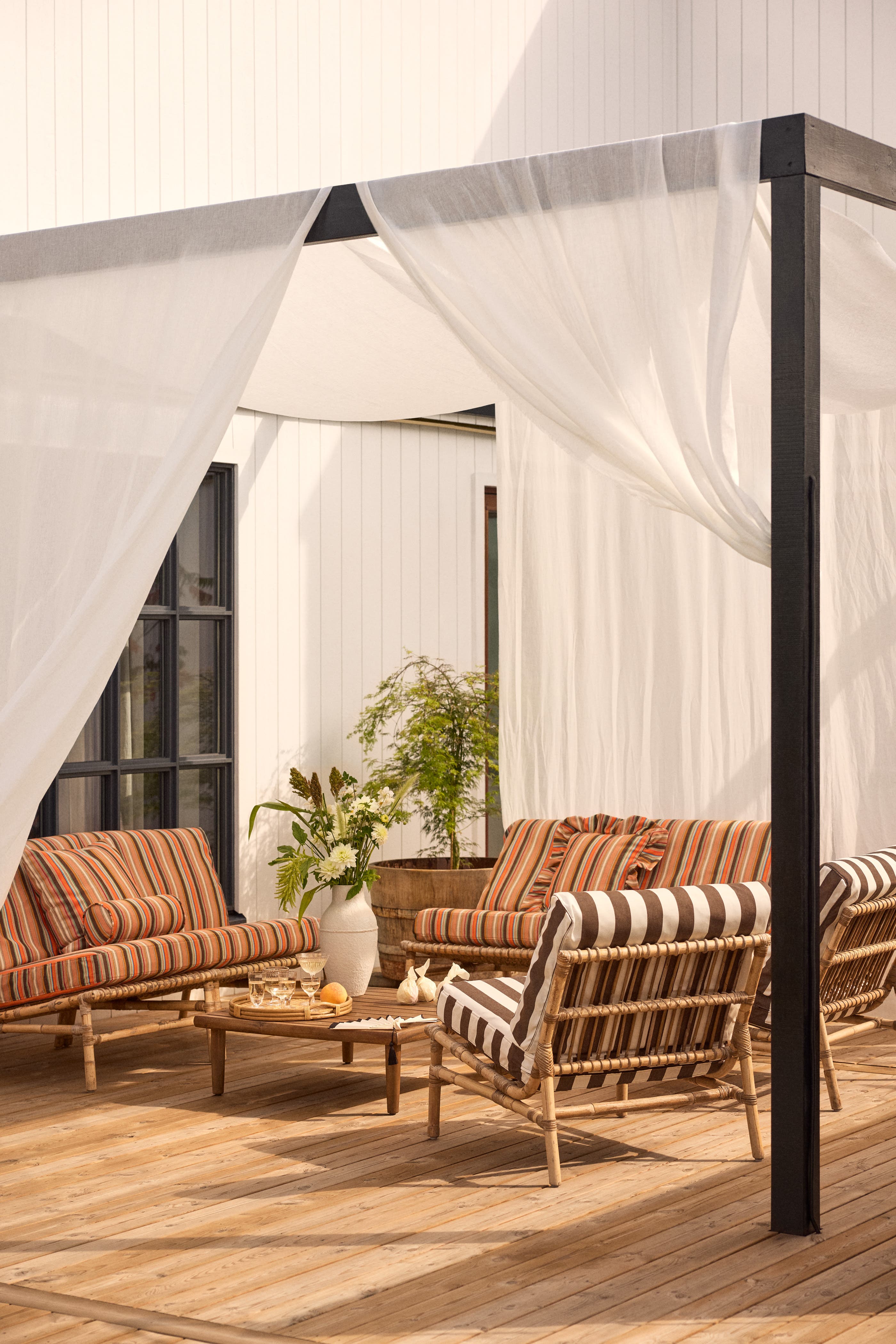 Laat je tuinmeubilair tot leven komen door er een nieuwe hoes omheen te doen. De zomerse kleurstelling leent zich uitstekend voor combinaties. Laat stevige strepen samengaan met aardeachtige pastelkleuren, doe er een hoofdsteun of rolkussen bij voor meer comfort of leg wat kussens op de grond voor een resultaat dat uitnodigt tot vertoeven.