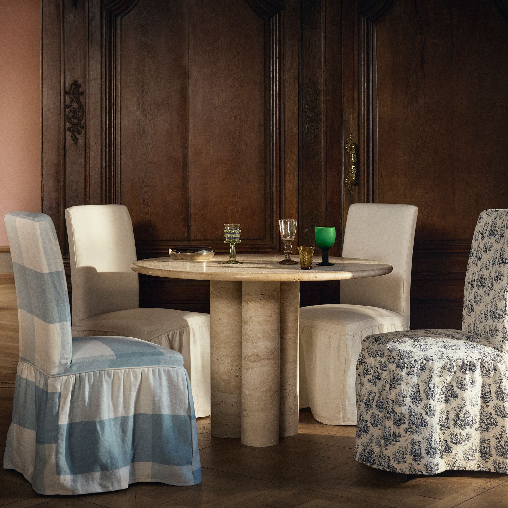 Eetkamerstoelen uit de Henriksdal-serie van IKEA met Maximalist Fit-hoezen van Bemz met uitbundige ruches, gemaakt van de stoffen Toile de Jouy in de kleur Dark Blue, Check Linen in de kleur Sky Blue en Cloud Linen in de kleur Soft White.