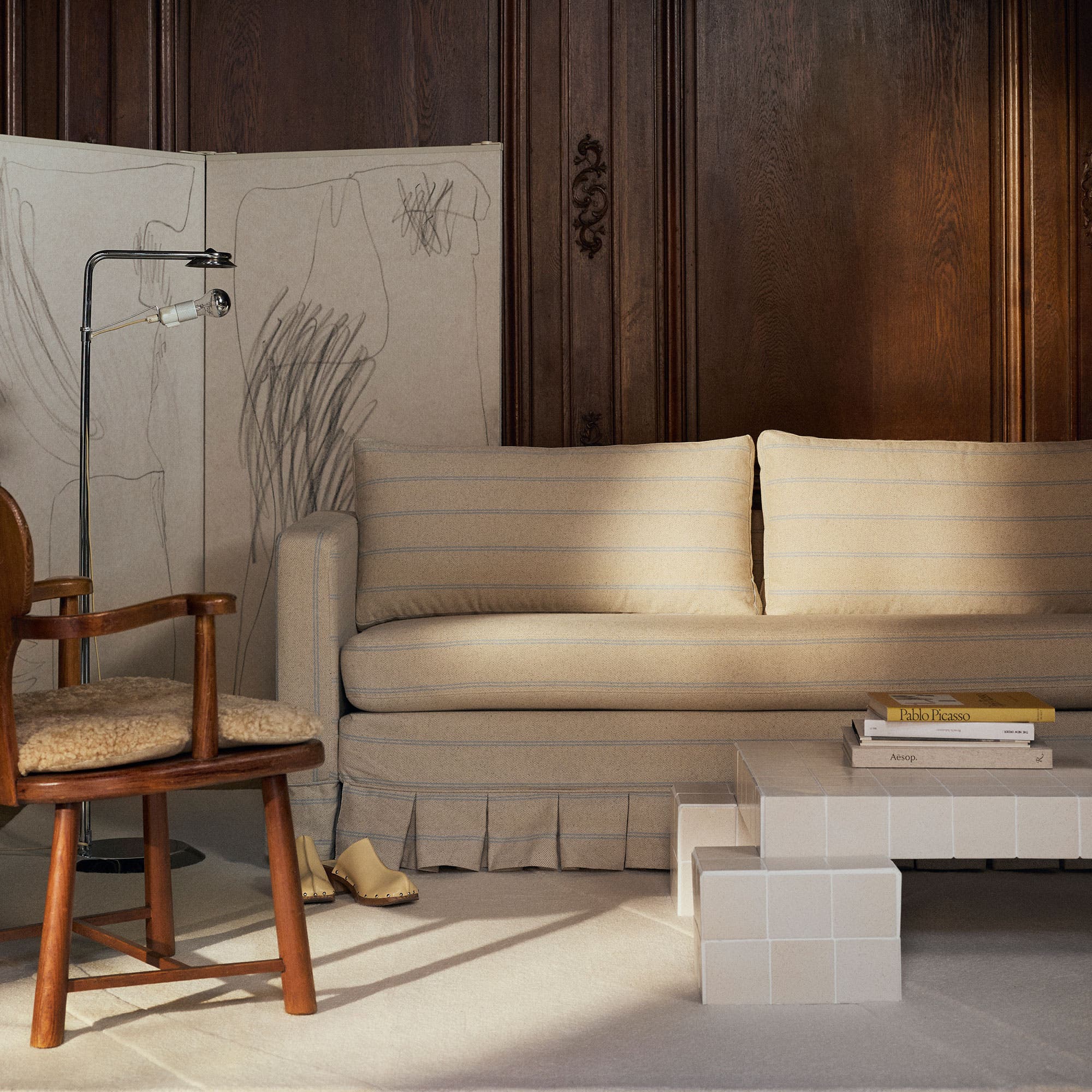 De strakke lijnen van de Söderhamn-serie van IKEA worden zachter dankzij de Maximalist Fit-hoezen van Bemz, gemaakt van de fijne stof Cloud Linen in de kleur Dusty Yellow.