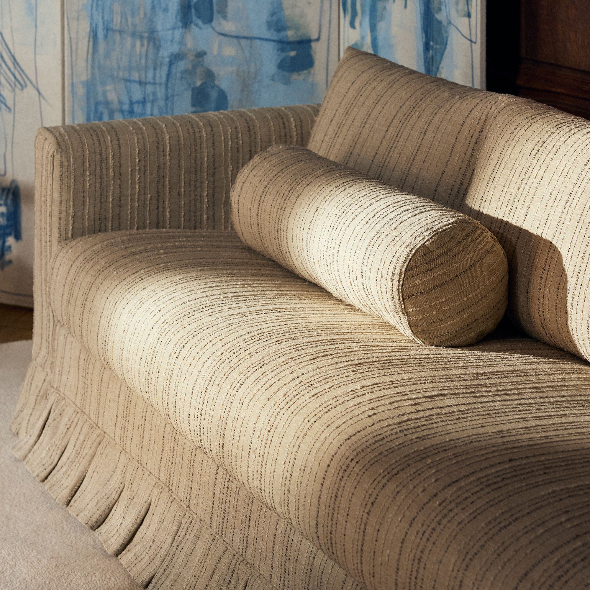 De veelzijdige Söderhamn-serie van IKEA in een Maximalist Fit-hoes van Bemz met ruches tot aan de grond, gemaakt van de frisse, lichte stof Check Linen in de kleur Sky Blue.